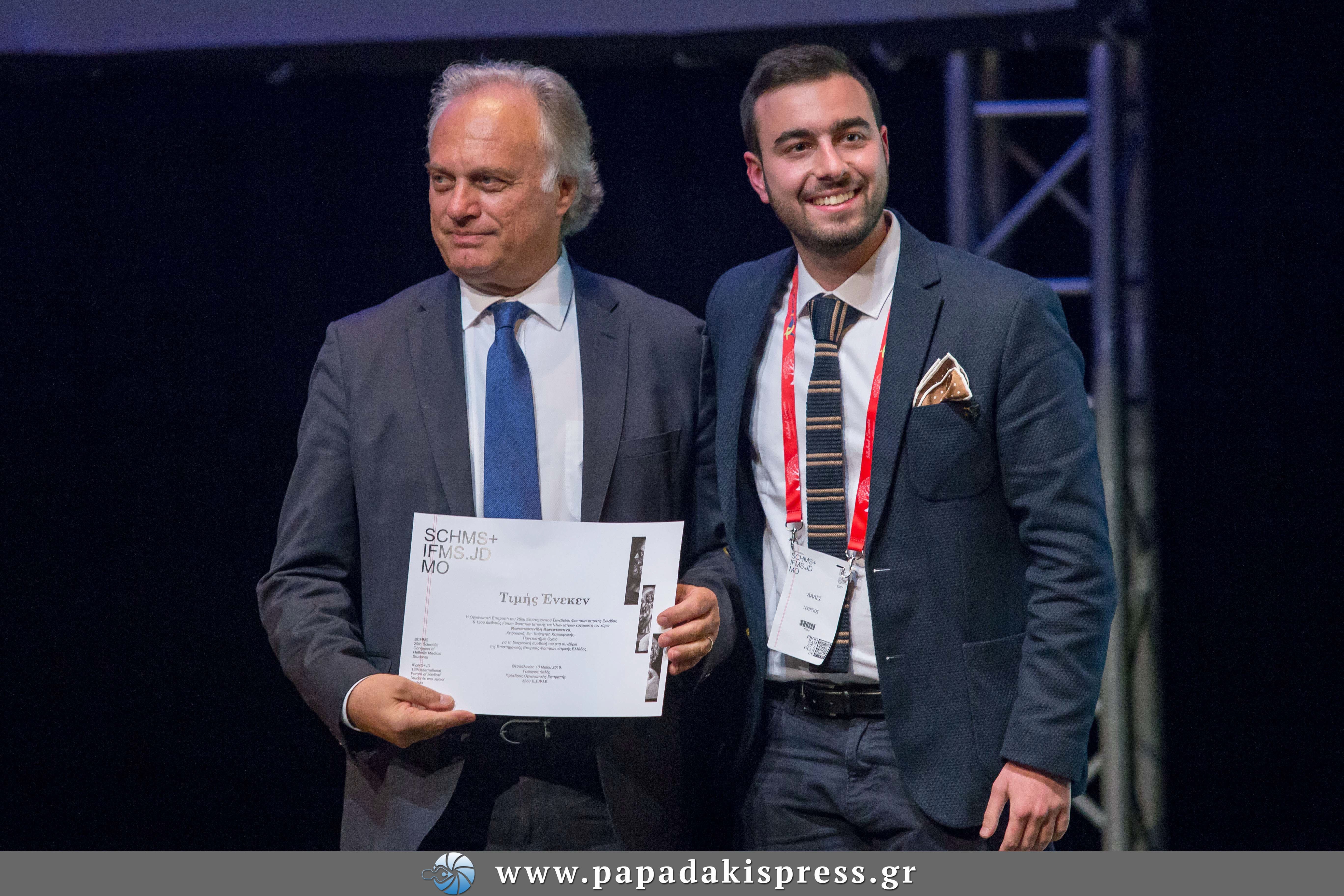 Αθήνα 17 Μαΐου 2019 - Στο πλαίσιο του 25ου Επιστημονικού Συνεδρίου Φοιτητών Ιατρικής Ελλάδας & 13ου Διεθνούς Forum Φοιτητών Ιατρικής και Νέων Ιατρών που διεξήχθη στις 10-12 Μαΐου στη Θεσσαλονίκη, μεταδόθηκε ζωντανά, τρισδιάστατα από το Ιατρικό Κέντρο Αθηνών, για πρώτη φορά στην Ελλάδα, αλλά και παγκοσμίως, 3D ρομποτική χειρουργική επέμβαση. Η επέμβαση, σε 67χρονη γυναίκα με διαφραγματοκήλη, γαστροοισοφαγική παλινδρόμηση και χολολιθίαση, πραγματοποιήθηκε στο Ιατρικό Κέντρο Αθηνών από το Δρ. Κωνσταντίνο Κωνσταντινίδη, MD, PhD, FACS, Γραμματέα Παγκόσμιας Επιστημονικής Εταιρείας Ρομποτικής Χειρουργικής CRSA, Επιστημονικό Διευθυντή Ομίλου Ιατρικού Αθηνών, Διευθυντή Γενικής, Ογκολογικής, Λαπαροσκοπικής και Ρομποτικής Χειρουργικής Ιατρικού Κέντρου Αθηνών, Επίτιμο Πρόεδρο Επιστημονικής Εταιρείας Ρομποτικής Χειρουργικής Νοτιοανατολικής Ευρώπης. Οι φοιτητές απένειμαν τιμητική διάκριση στον Δρ. Κωνσταντινίδη για την διαχρονική του συμβολή στα συνέδρια τους.
