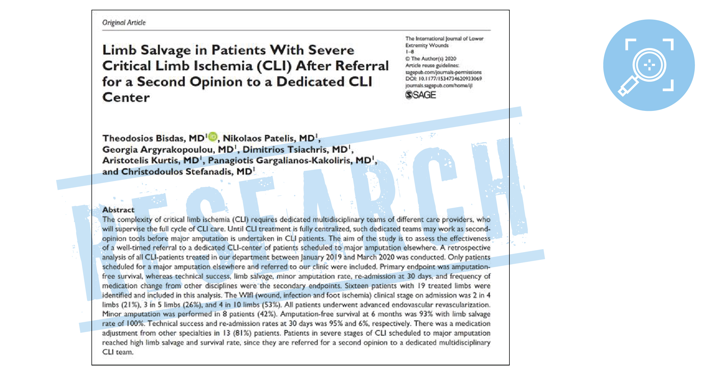 Τα συμπεράσματα της έρευνας, με τίτλο: «Limb salvage in patients with severe critical limb ischemia after referral for a second opinion to a dedicated CLI center» δημοσιεύθηκαν στο έγκριτο επιστημονικό περιοδικό που εξειδικεύεται στην αντιμετώπιση του διαβητικού ποδιού, με τίτλο: «The International Journal of Lower Extremity Wounds».