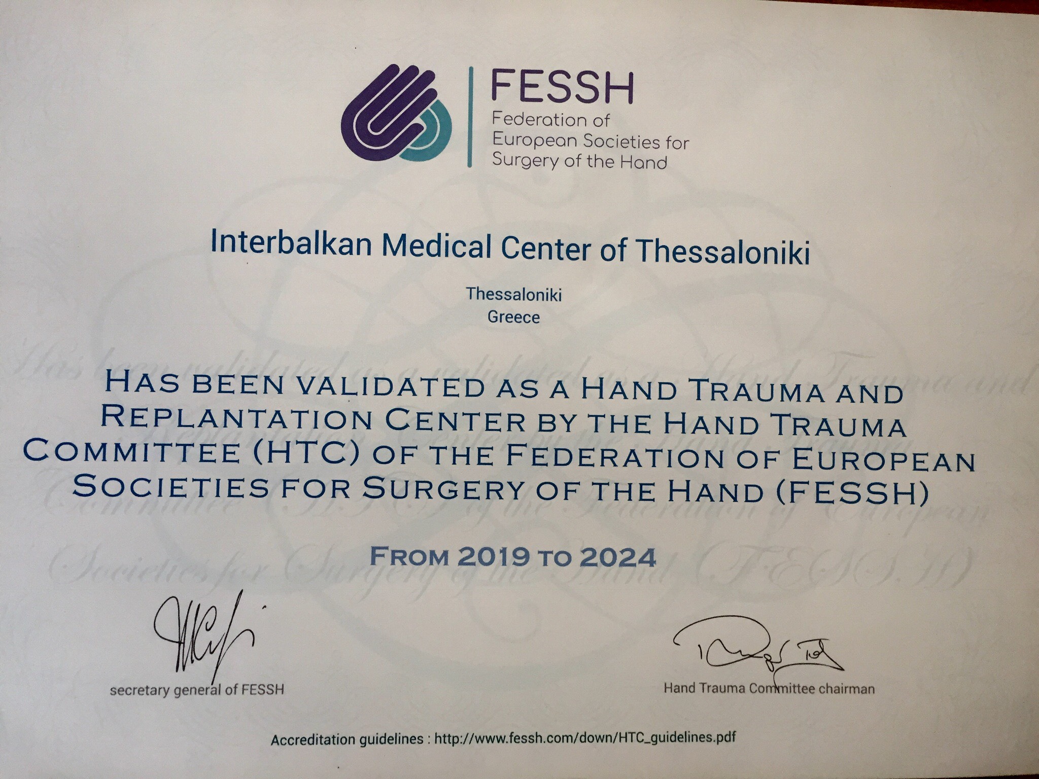 Επίσημο πιστοποιημένο Ευρωπαϊκό Κέντρο Τραύματος Χεριού και Συγκολλήσεων αποτελεί το Τμήμα Χειρουργικής Χεριού και Μικροχειρουργικής του Ιατρικού Διαβαλκανικού Θεσσαλονίκης, μετά την απόκτηση της Ευρωπαϊκής πιστοποίησης FESSH (Ομοσπονδία Ευρωπαϊκών Επιστημονικών Εταιρειών Χειρουργικής Χεριού).