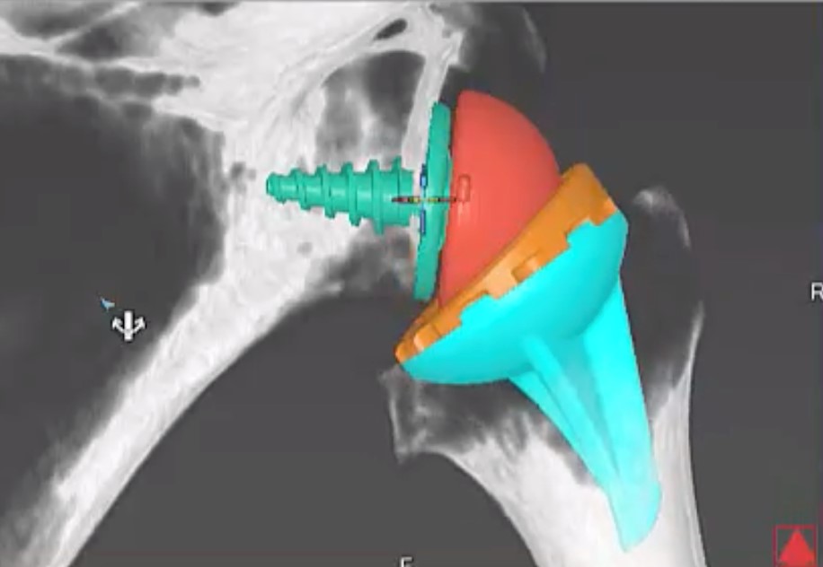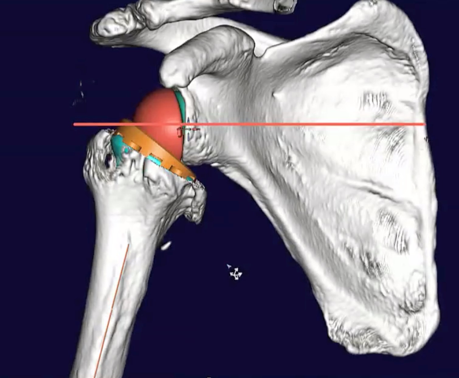 Εξατομικευμένο προεγχειρητικό πλάνο με τη χρήση ψηφιακού τρισδιάστατου μοντέλου - απεικονίζεται το εύρος κινήσεως του ώμου μετά την τοποθέτηση των υλικών |