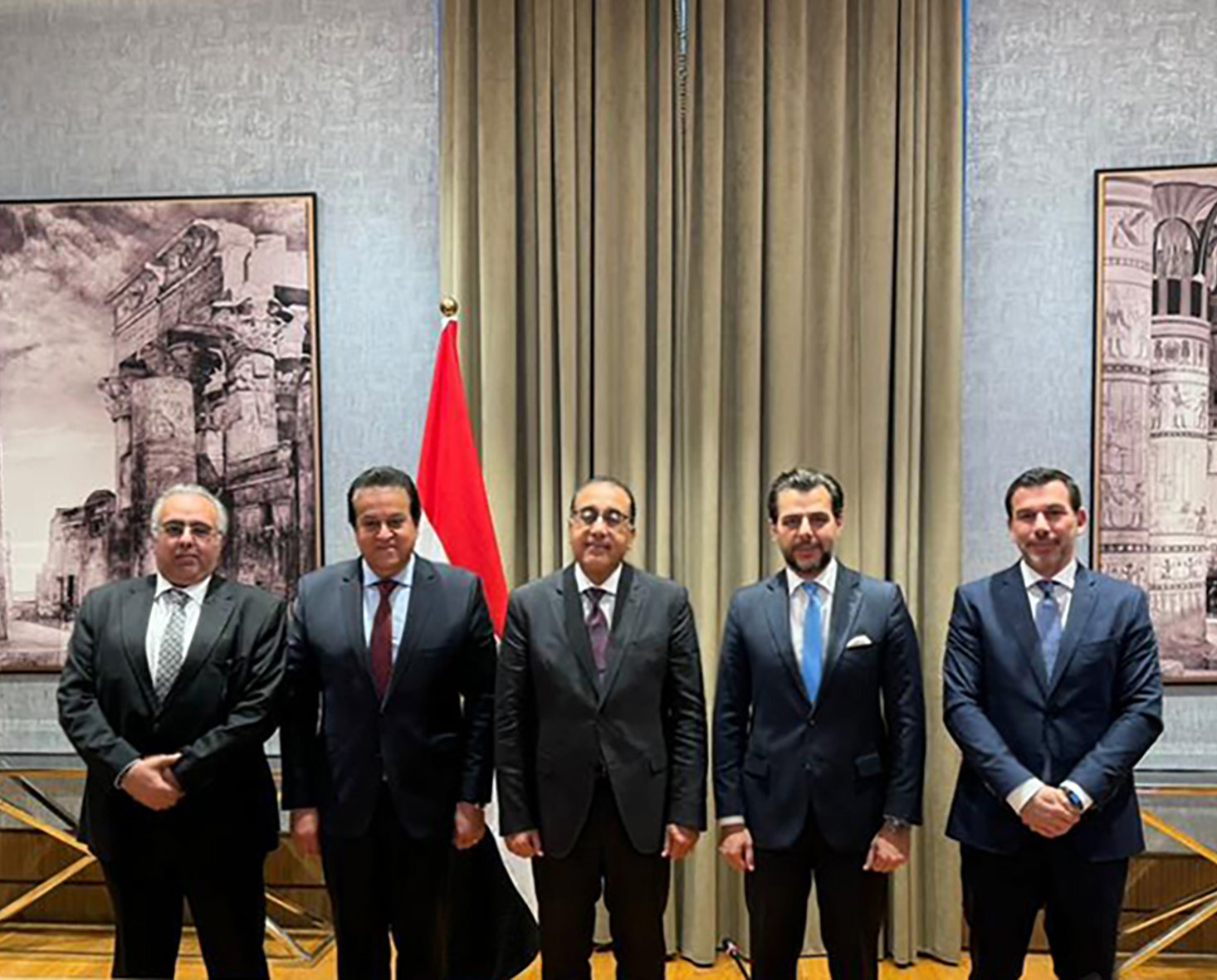 Ο Δρ. Βασίλης Αποστολόπουλος και ο κ. Γιώργος Ζέρδιλας με τον Πρωθυπουργό της Αιγύπτου, Δρ. Μουσταφά Μαντμπουλί και τον Υπουργό Υγείας και Πληθυσμού της Αιγύπου, Δρ. Χαλέντ Αμπντέλ Γκαφάρ.