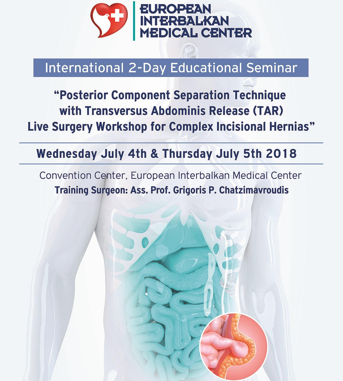 Το Ιατρικό Διαβαλκανικό Θεσσαλονίκης οργανώνει αύριο Τετάρτη 4 και την Πέμπτη 5 Ιουλίου, το δεύτερο διεθνές εκπαιδευτικό σεμινάριο (live surgery workshop) για την εκπαίδευση συνολικά 6 Χειρουργών από το Ντουμπάι και την Τουρκία, πάνω στις πλέον σύγχρονες και προηγμένες - εξειδικευμένες τεχνικές για την αποτελεσματική αντιμετώπιση μεγάλων μετεγχειρητικών κηλών. Η εκπαίδευση των ξένων χειρουργών, θα γίνει από τον εξειδικευμένο στη χειρουργική των κηλών και την ανακατασκευή των κοιλιακών τοιχωμάτων, επικ. Καθηγητή Χειρουργικής του ΑΠΘ και συνεργάτη του Ιατρικού Διαβαλκανικού, Γρηγόριο Π. Χατζημαυρουδή και αφορά στον οπίσθιο διαχωρισμό των κοιλιακών τοιχωμάτων με διατομή του εγκάρσιου κοιλιακού μυός (τεχνική TAR –Transversus Abdominis Release).