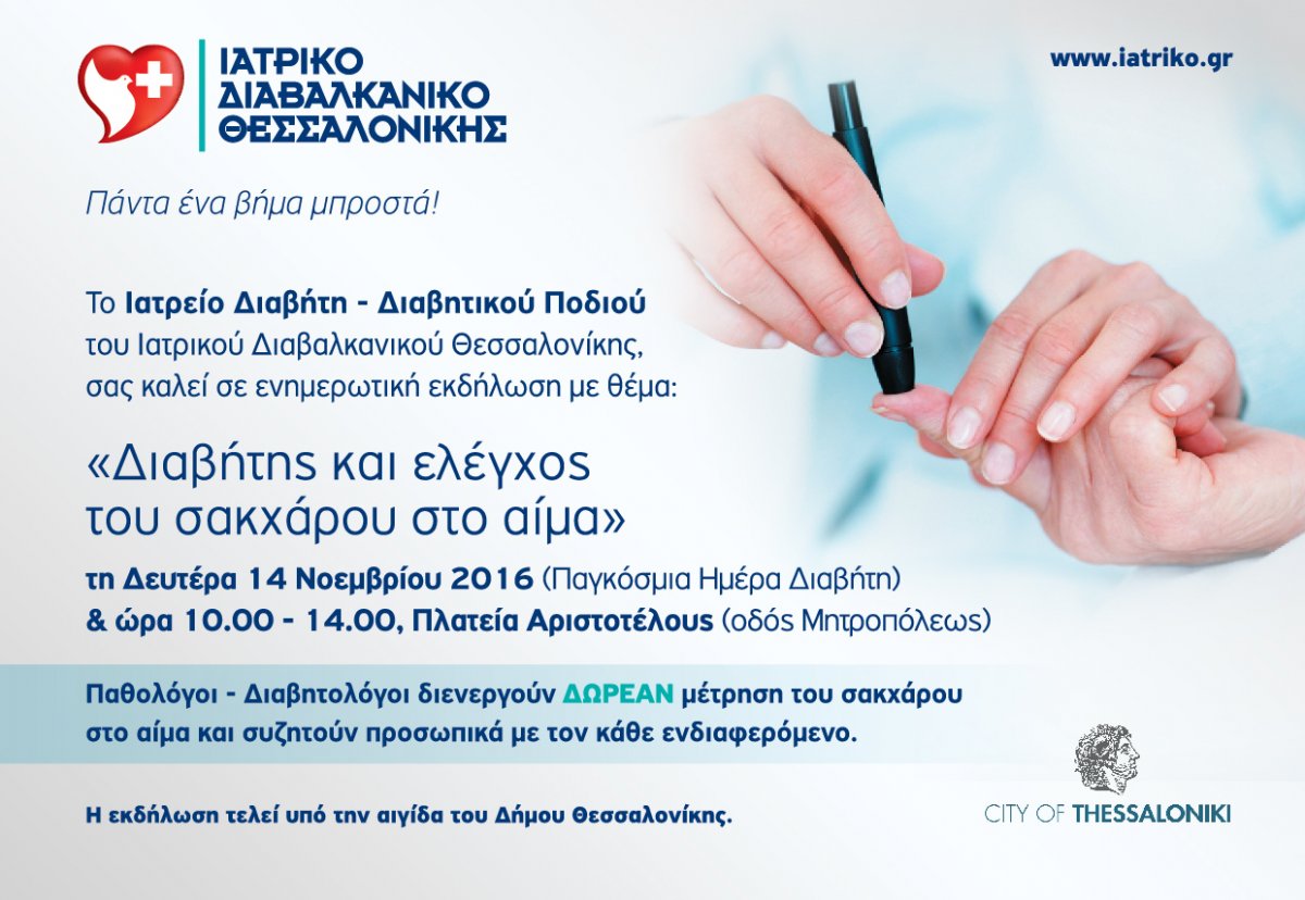 Το Ιατρείο Διαβήτη – Διαβητικού Ποδιού του Ιατρικού Διαβαλκανικού, υποδέχεται το κοινό που επιθυμεί να ενημερωθεί, σε ειδικά διαμορφωμένο χώρο στην πλατεία Αριστοτέλους (ύψος Μητροπόλεως) και κατά τις ώρες, 10.00 – 14.00. Παθολόγοι – Διαβητολόγοι με μεγάλη εμπειρία, συζητούν με τους ενδιαφερόμενους, μετά την επιτόπου δωρεάν εξέταση σακχάρου (γλυκόζης) στο αίμα και ακολούθως παρέχουν προσωπικές ιατρικές συμβουλές.