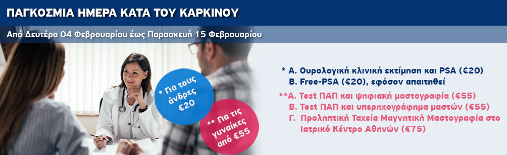 Αθήνα, 4 Φεβρουαρίου 2019 – Εξετάσεις προληπτικού έλεγχου για όλους, σε ειδικές μειωμένες τιμές, προσφέρει ο Όμιλος Ιατρικού Αθηνών, με αφορμή την Παγκόσμια Ημέρα κατά του Καρκίνου.