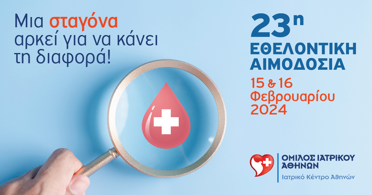 Η εθελοντική αιμοδοσία είναι μια πολύ σημαντική πράξη αλληλεγγύης και ανθρωπιάς. Η δωρεά αίματος μπορεί να σώσει ζωές και να βοηθήσει ανθρώπους που έχουν ανάγκη. Λόγω της μειωμένης εθελοντικής προσφοράς και των αυξημένων αναγκών που παρουσιάζονται, η συνεισφορά όλων μας, είναι απαραίτητη. Για το σκοπό αυτό, το Ιατρικό Κέντρο Αθηνών και οι εργαζόμενοί του απευθύνουν πρόσκληση συμμετοχής στο ευρύ κοινό, προκειμένου να μεγιστοποιηθούν τα οφέλη της δράσης.