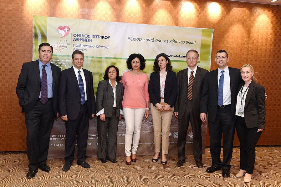 Στιγμιότυπο από την ημερίδα. Από αριστερά: Ιωάννης Σταύρακας, Χειρουργός-Οφθαλμίατρος, Νικόλαος Ματθαίου, Διευθυντής του Τμήματος Γλαυκώματος Ενηλίκων και Παίδων του Ομίλου Ιατρικού Αθηνών, Φαριμπά Σαρίφη, Επικεφαλής Α’ Παιδιατρικής Κλινικής του Παιδιατρικού Κέντρου Αθηνών, Γεωργία Νύκταρη, Διευθύντρια ΜΕΝΝ της ΓΑΙΑ, Βασιλική Φωλλίδη, Επιμελήτρια Οφθαλμολογικής Κλινικής Παιδιατρικού Κέντρου Αθηνών, Σταμάτης Γκατζώνης, Διευθυντής Παιδοφθαλμολογικής Κλινικής Παιδιατρικού Κέντρου Αθηνών, Νίκος Μόσχος, Διευθυντής Επιχειρησιακής Ανάπτυξης Ομίλου Ιατρικού Αθηνών, Ρίτσα Μπιρζαμάνη, Product Manager Παιδιατρικού Κέντρου Αθηνών.