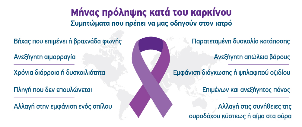- Την άμεση αξιολόγηση και επίγνωση των αρχόμενων συμπτωμάτων των διαφορετικών μορφών καρκίνου και της σημασίας της αναζήτησης ιατρικής συμβουλής και βοήθειας όταν αυτά παρατηρούνται.