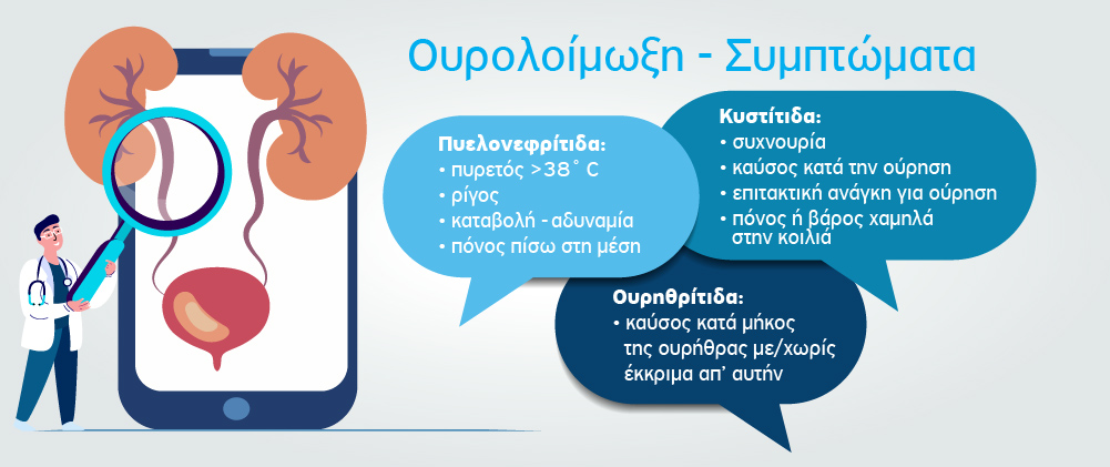 Τα συμπτώματα εξαρτώνται από την εντόπιση. Στην πυελονεφρίτιδα: πυρετός >380C, ρίγος, καταβολή – αδυναμία, πόνος στην περιοχή του πάσχοντος νεφρού (πίσω στη μέση). Στην κυστίτιδα: συχνουρία, καύσος κατά την ούρηση, επιτακτική ανάγκη για ούρηση, πόνος ή βάρος χαμηλά στην κοιλιά. Στην ουρηθρίτιδα: καύσος κατά μήκος της ουρήθρας με/χωρίς έκκριμα απ’ αυτήν.